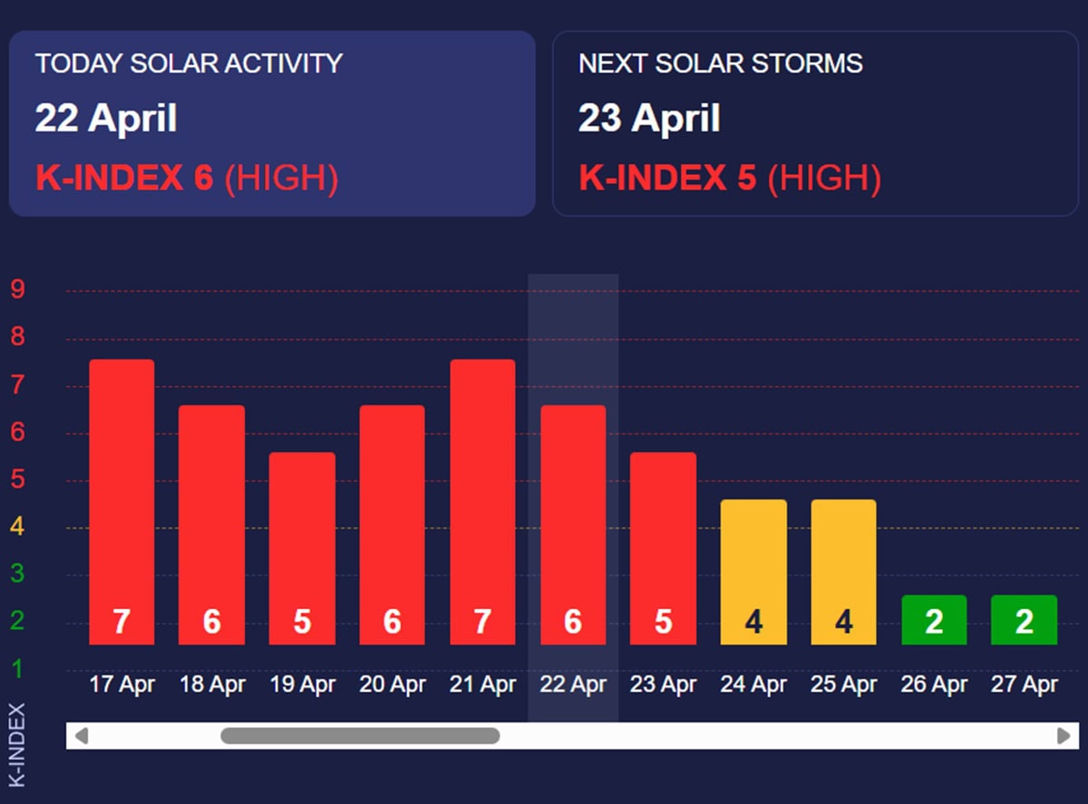 Так, у вівторок, 22 квітня очікується потужний удар магнітної бурі. За прогнозами, рівень активності зросте до К-індексу 6 — це вже буря червоного рівня.