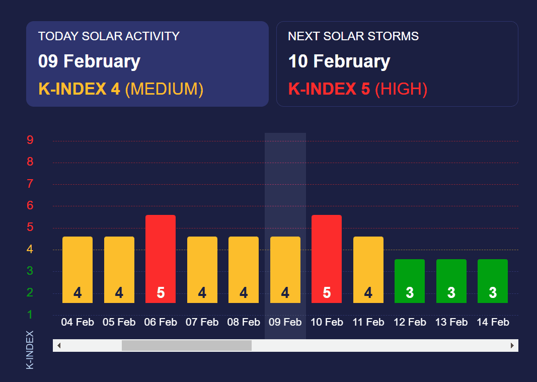 Також варто зазначити, що найближчі дні, 10 лютого, сонячна активність підвищиться до К-індексу 5 і перейде в червону зону, що може викликати певний дискомфорт у людей.