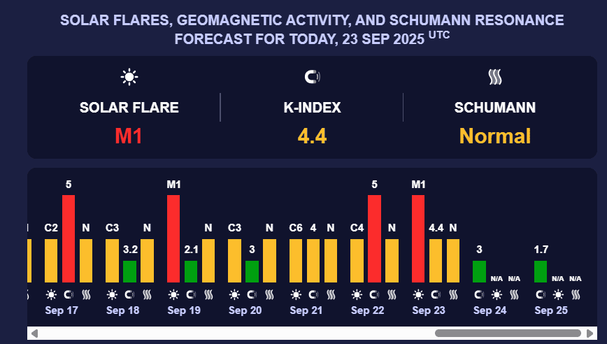 Після кількох днів підвищеної активності, коли спостерігалися спалахи класу М1 та підвищений індекс Kp понад 4, 24 вересня показники стабілізуються. Це означає, що суттєвого впливу на роботу техніки, супутників чи енергосистем не очікується.