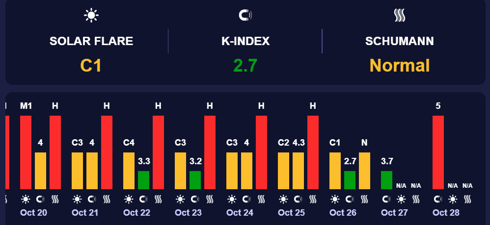 26 жовтня 2025 року — тихий і сприятливий день із мінімальною сонячною активністю (C1) і стабільним індексом Kp = 2.7.