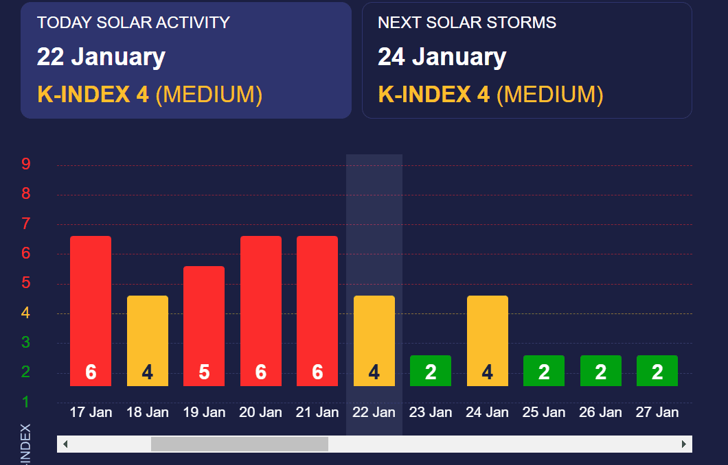 Згідно з прогнозом meteoagent у середу, 22 січня, очікується несильна магнітна буря з К-індексом 4 (жовтий рівень), нездатна впливати на самопочуття людей.