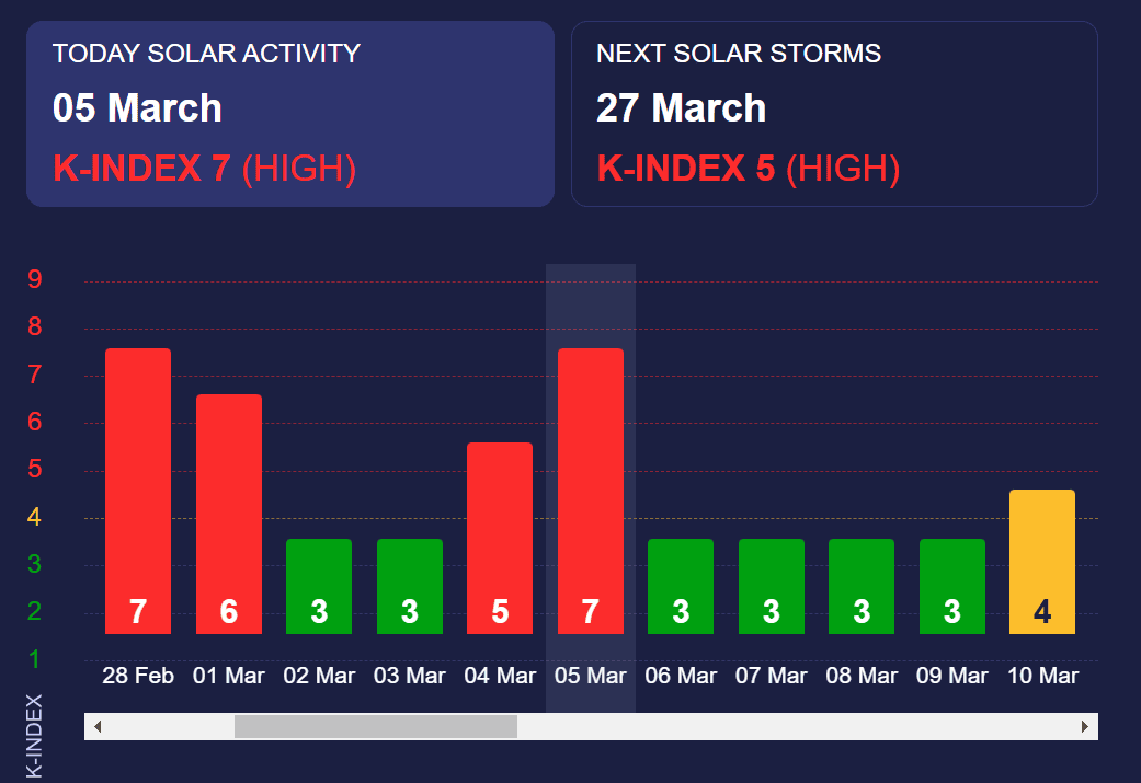 У вівторок, 5 березня, К-індекс зріс до 7, що вказує на сильні магнітні бурі.