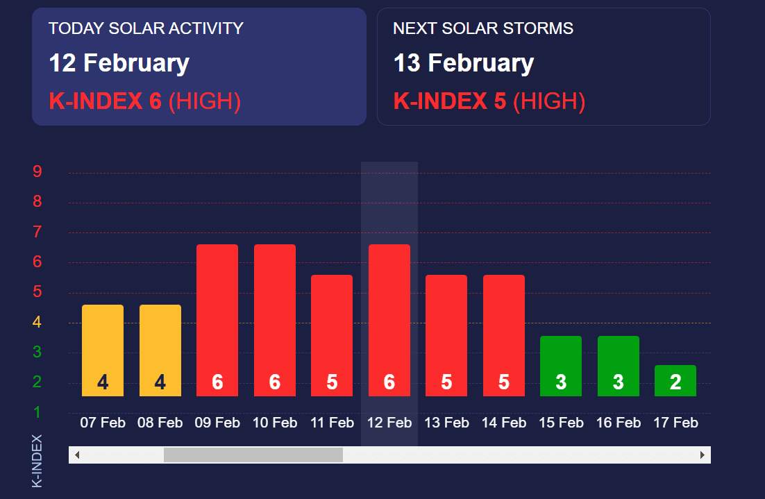 Прогнози свідчать, що сьогодні 12 лютого сильно штормитиме з К індексом 6. З 13 по 14 лютого магнітна буря буде на рівні 5 балів, а з 15 лютого опуститься до 3 балів.