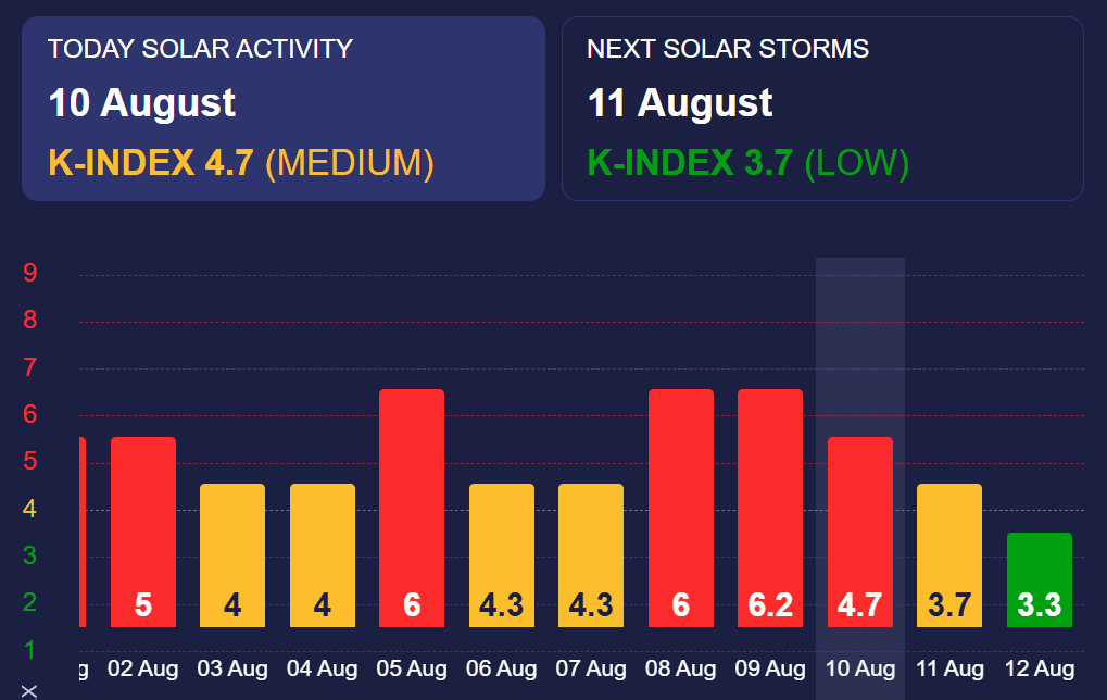 За прогнозом Мeteoagent.com, вже завтра, 11 серпня, активність знизиться до K-індексу 3,7 (низький рівень), тож негативний вплив на організм зменшиться.
