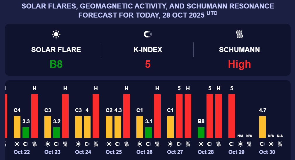 За даними сервісу Метеоагент, у вівторок, 28 жовтня 2025 року, на Землі очікується сильна магнітна буря. Геомагнітний індекс Kp сягне рівня 5, що відповідає бурі середньої інтенсивності, здатній впливати як на технічні системи, так і на самопочуття людей.