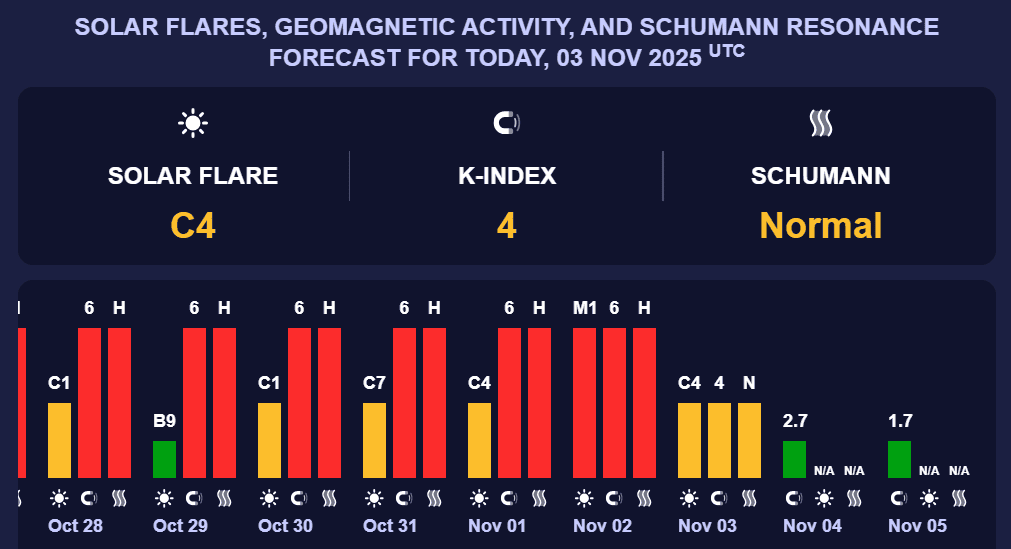 3 листопада: зниження активності — C4, K-index 4, рівень Шумана нормальний.