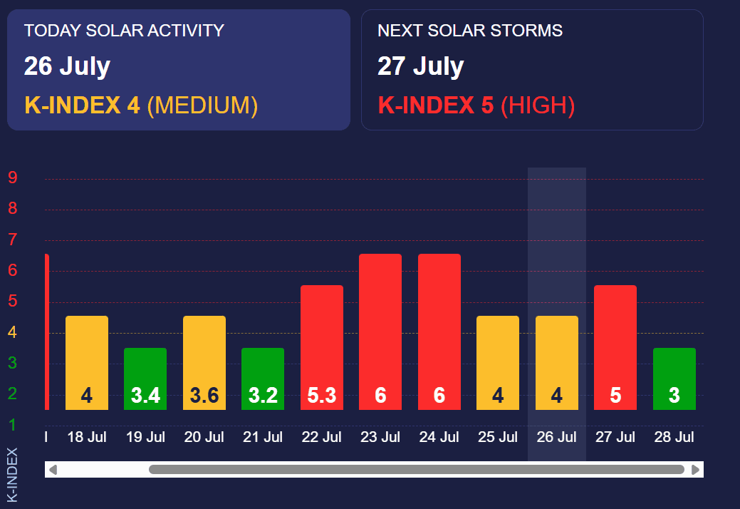 28 липня 2025 року геомагнітна обстановка стабілізується — прогнозується K-індекс 3, тобто низький рівень активності. Це означає, що негативний вплив на самопочуття та техніку поступово зменшиться.