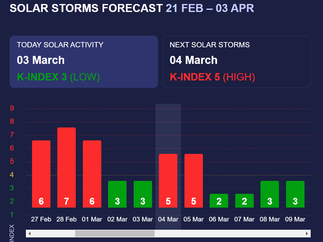 Нарешті, у середу, 6 березня, магнітна активність знизиться до К-індексу 2 (зелений рівень), що означає наявність лише слабких магнітних бур.