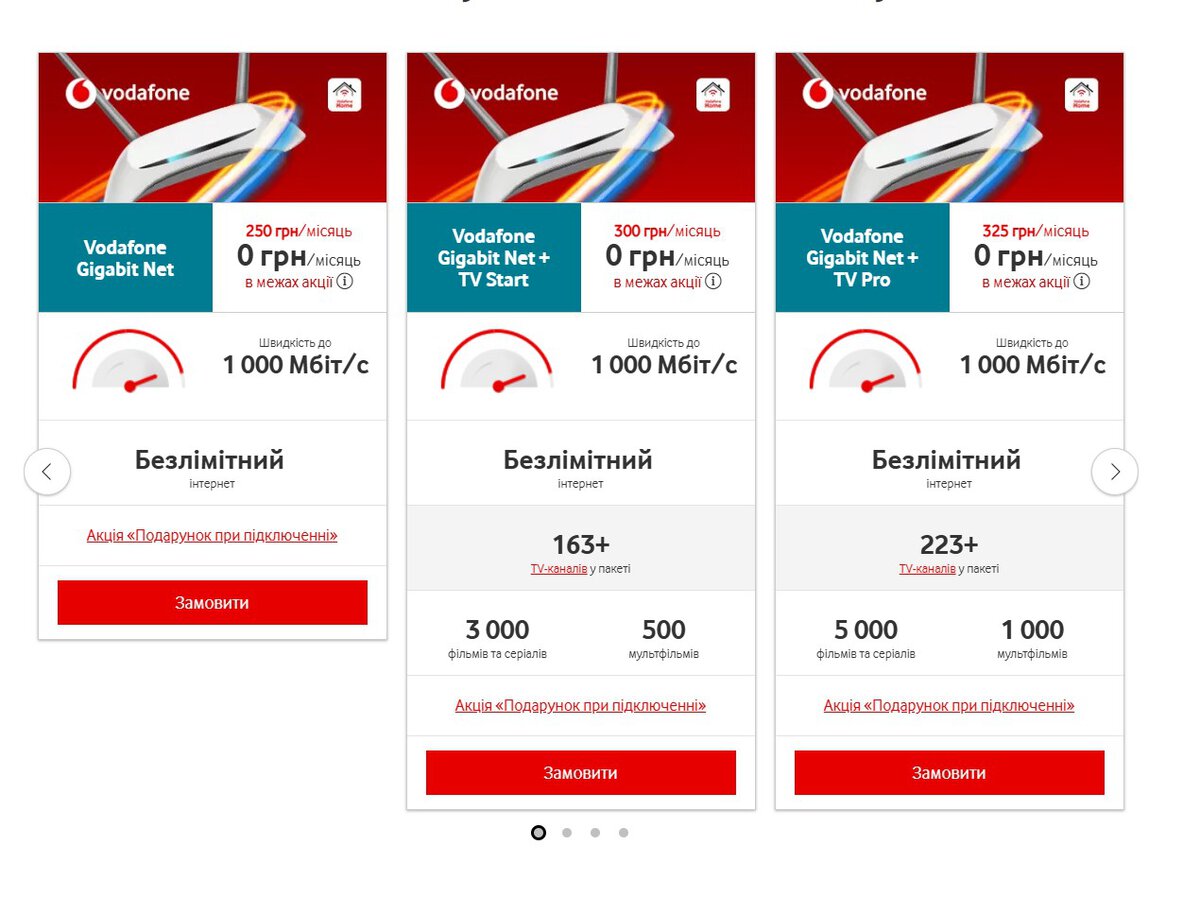 Клієнтам пропонують обрати один із трьох пакетів лінійки Vodafone Gigabit Net, що відрізняються швидкістю та обсягом трафіку. Це ідеальний спосіб протестувати швидкісний інтернет без фінансових витрат і переконатися в його якості.