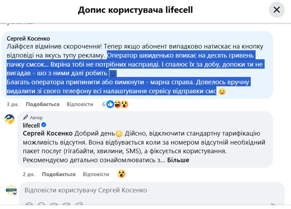 В свою чергу, представники Lifecell пояснили, що відключення стандартної тарифікації SMS дійсно неможливе. Згідно з офіційною позицією компанії, тарифікація відбувається автоматично, коли за номером відсутній необхідний пакет послуг, що включає гігабайти, хвилини та SMS. При цьому компанія рекомендує абонентам детально ознайомлюватися з умовами акцій та пропозицій перед їх підключенням.